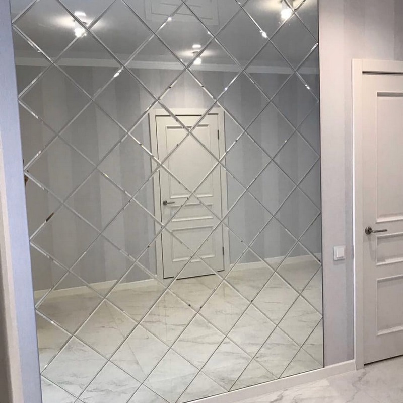 Использована квадратная серебристая зеркальная плитка размером 18х18.